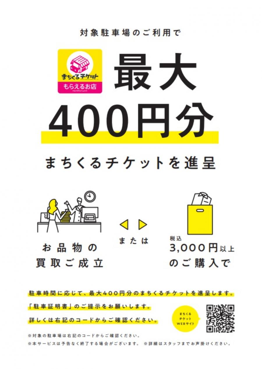 お買取り成立か税込み3000円以上ご購入で駐車時間に応じて最大400円割引のまちくるチケットを配布しております。