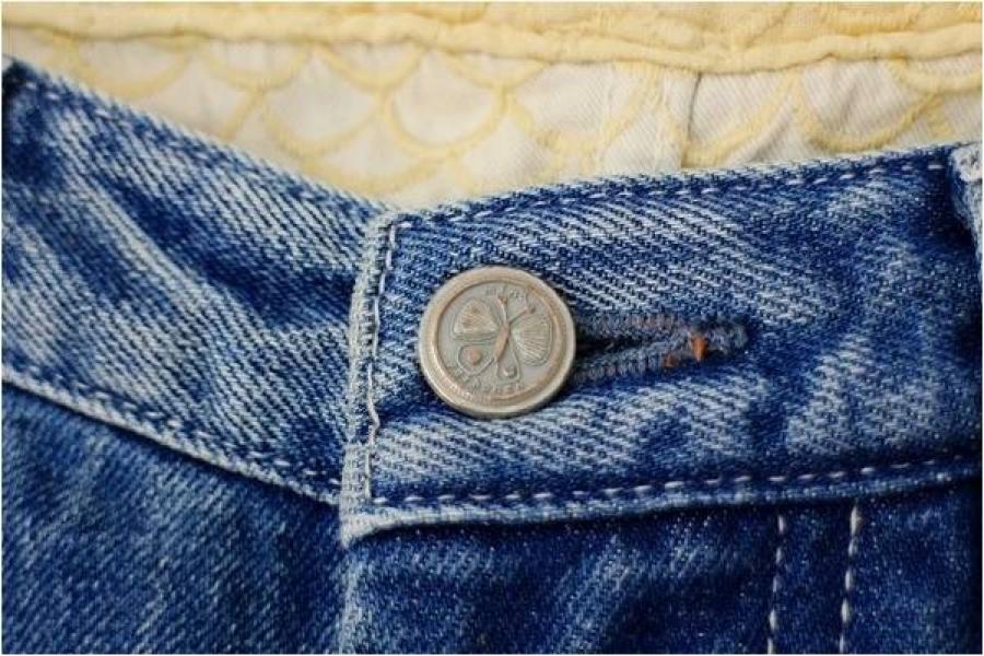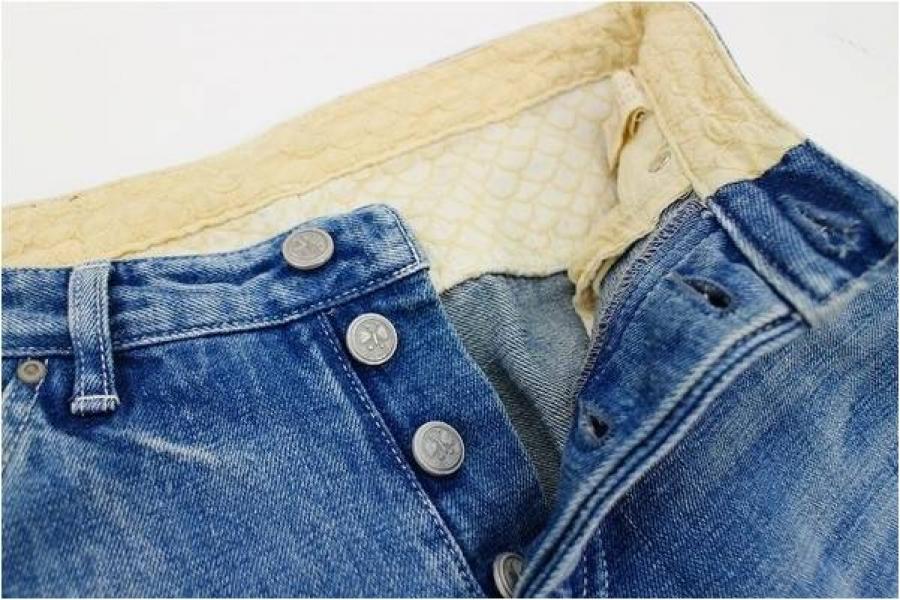 ボタンに蝶々が刻印されていたり、ベルト裏やポケット裏にマーメイド柄の刺繍が施されいたりと、