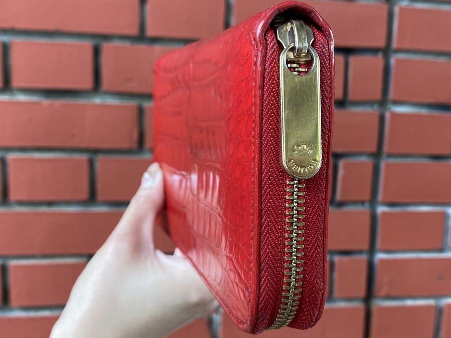 LOUISVUITTONではめったに見ることのない、赤色のクロコダイルの型押し財布で、ジップにLOUIS VUITTONの刻印がされています。