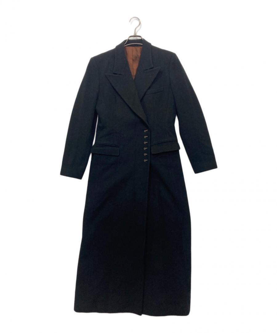 このコートは、そのゴルチエ氏の美学が凝縮されたような、非常に存在感のある一着です。膝下まで伸びるスーパーロング丈に、武骨ながらもどこかエレガントなフック釦が特徴的で、まさに一目でゴルチエとわかるデザインです。