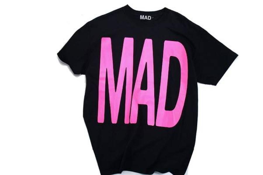 UNDERCOVER "MAD" TEEこちら黒のボディにネオンピンクで"MAD"とプリントされた
