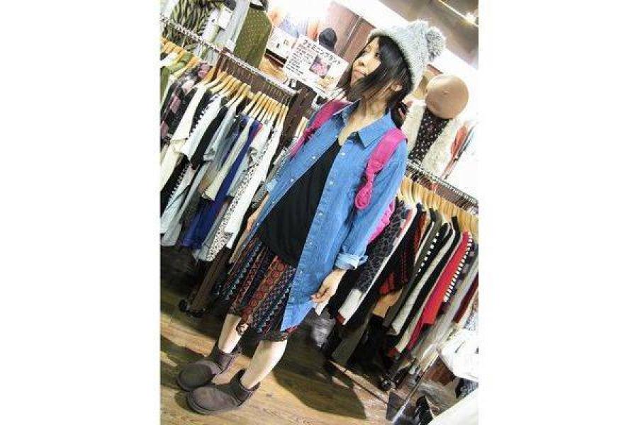デニムシャツを羽織にして、ボトムは《muchacha ムチャチャ》の総柄スカートで秋色+ポップな印象に♪