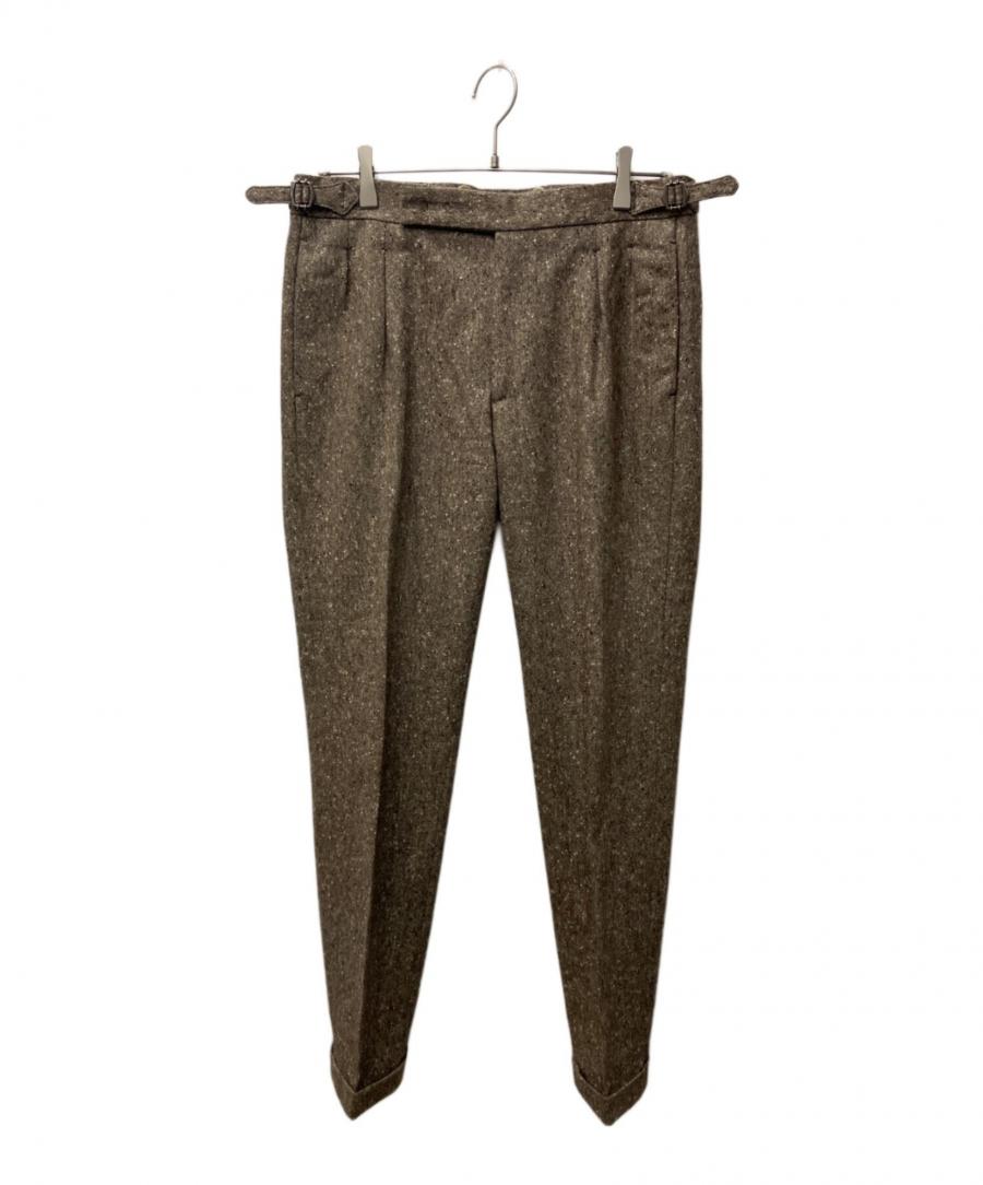 サイズ表記は46となっており、日本人の体型にも馴染みやすいすっきりとしたサイズ感です。ジャケットは肩回りの副資材を極力省いた軽やかな仕立てでありながら、着用すると背筋がスッと伸びるような立体的で美しいシルエットを描きます。パンツは腰回りに適度なゆとりを持たせつつ、裾に向かってテーパードを効かせているため、細身ながらも窮屈さを感じさせない素晴らしい着用感を実現しています。